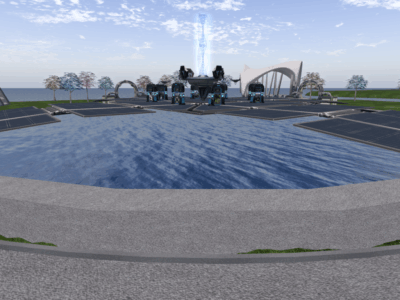 One particular landmark of Hypergrid Resource Island is that it also offers a set of gates to various Open Sim locations in the center of the island. These gates have been curated by the Community Virtual Library and the Virtual World Education Consortium to take avatars to educational areas on the OpenSimulator worlds.