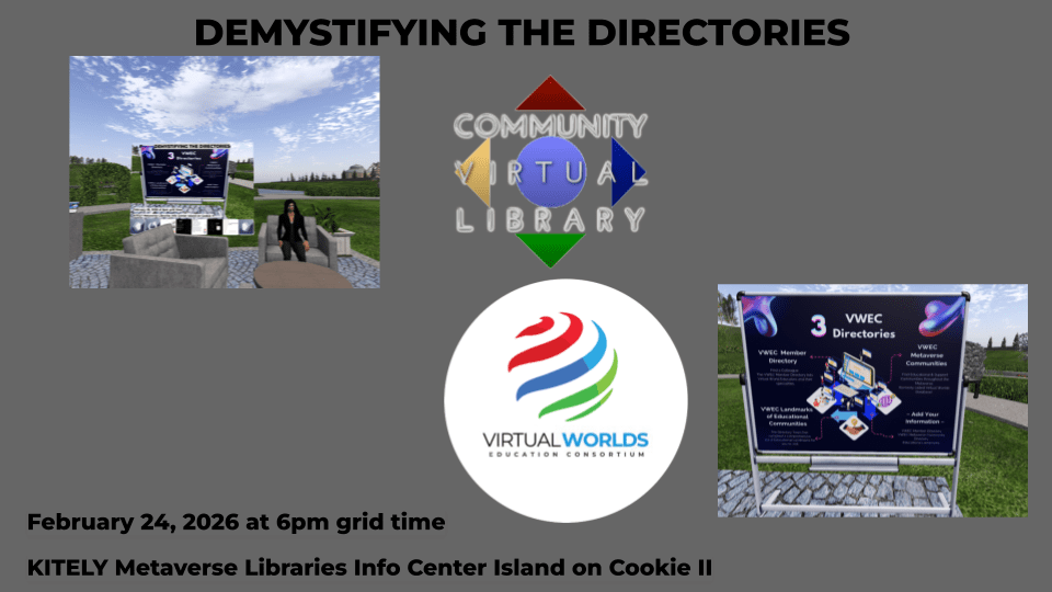 This event is scheduled for February 24, 2026, at 6pm at Cookie II on Kitely, where the Hypergrid Resource Library is located. The person leading the informational event will be Kreatya Shannon, who serves as the Directory Lead for Community Virtual Library. She is also the Virtual Worlds Education Consortium Ambassador for Kitely. Attendees will meet at the Info Center island first (as that is the spawn point for the region) and then be taken to the classroom area.